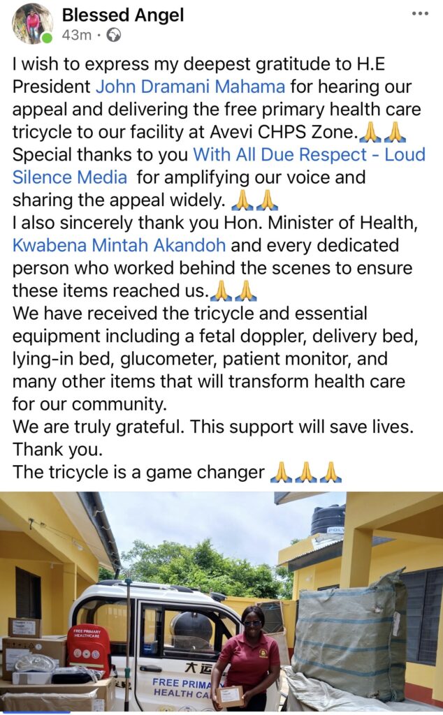 The hardworking midwife whose post went viral recently after appealing to the President to donate one of the Free Primary Health Care tricycles to facilitate healthcare delivery at Avevi CHPS Zone, located within the Akatsi North District, has gotten more than she requested for.